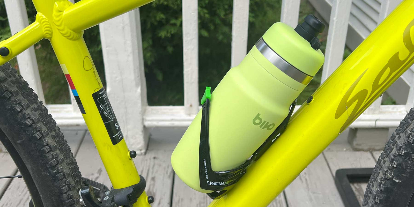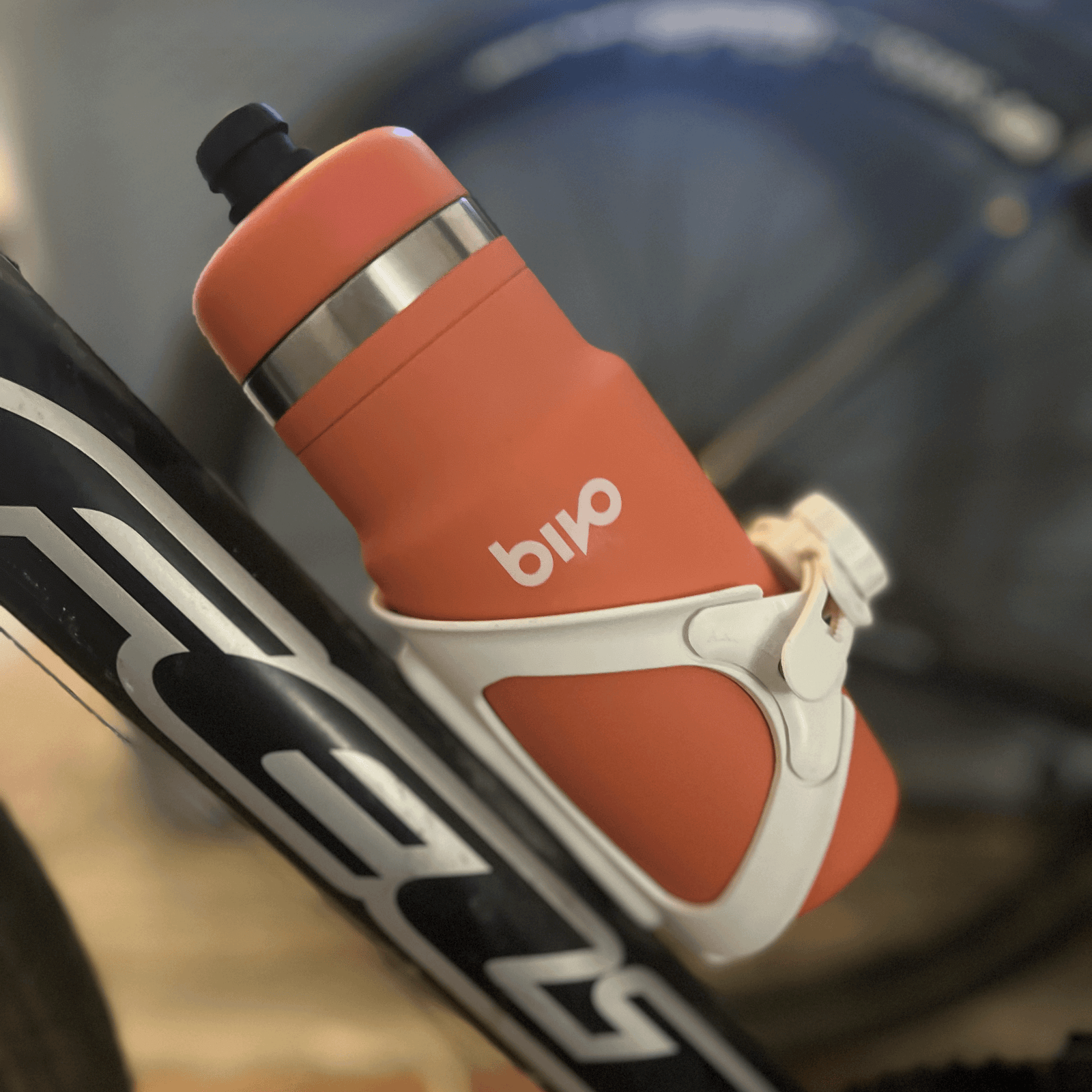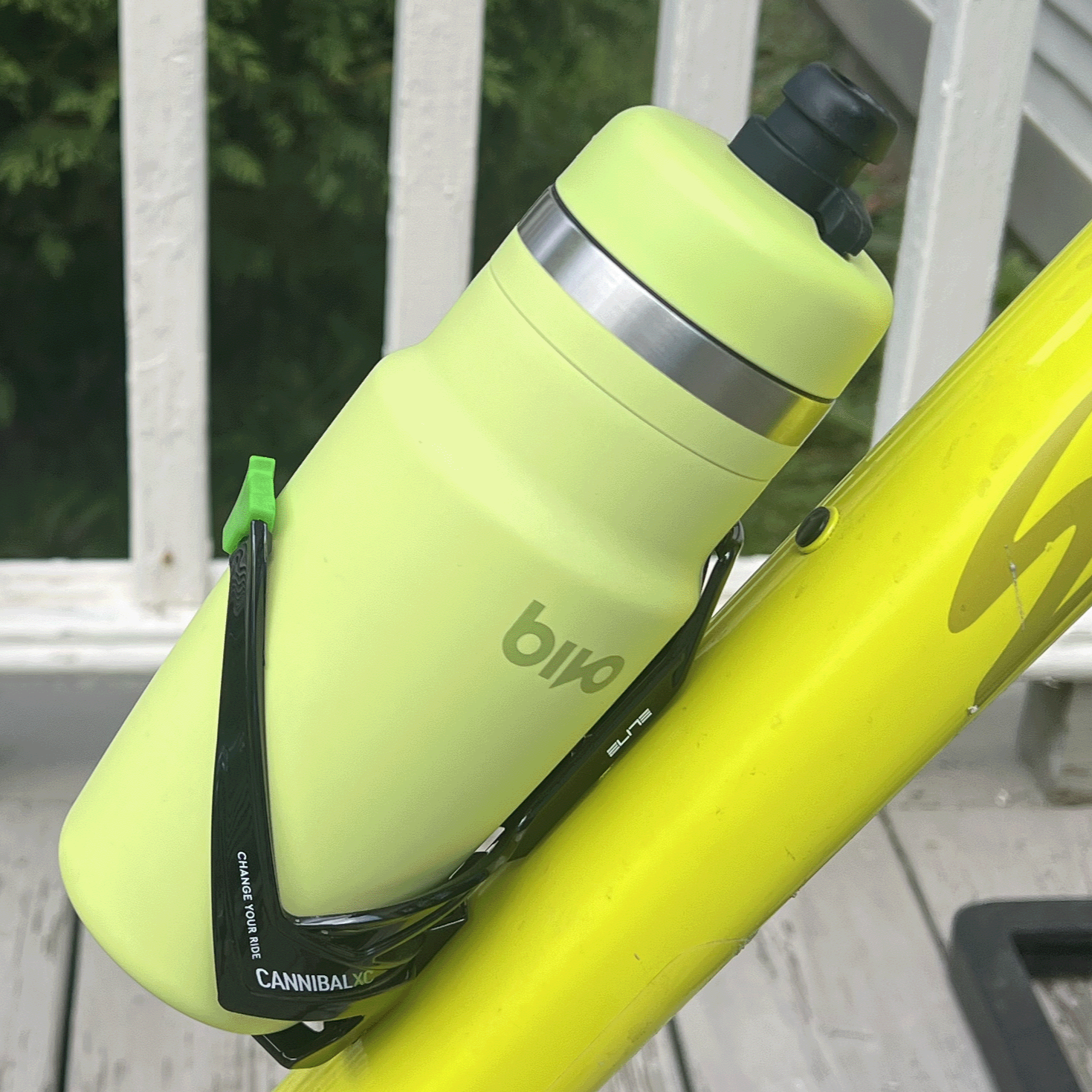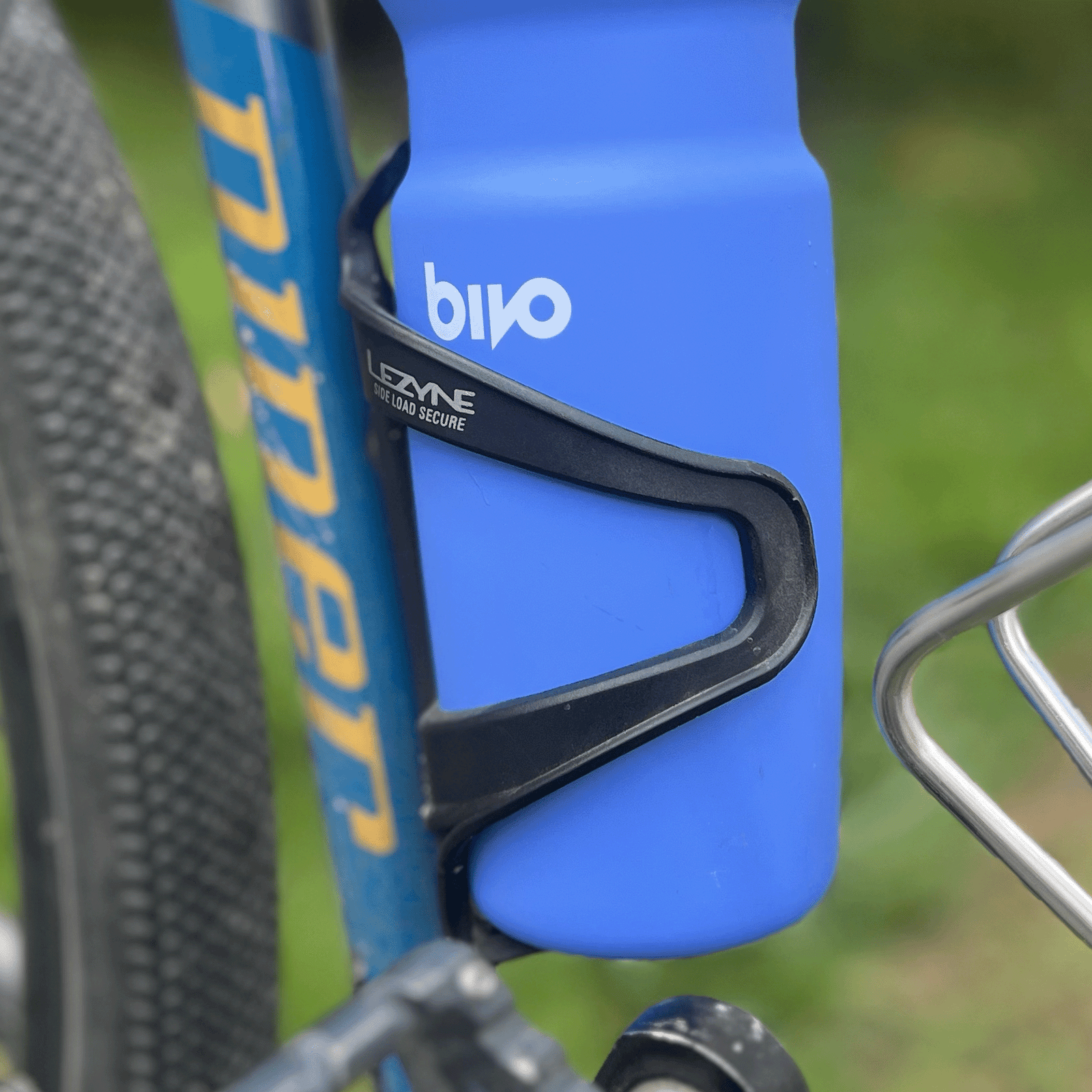 Image 1: Bivo Trio cycling bottle in the the Lezyne Side Load Flow Cage, Image 2: Bivo One in the Elite Cannibal XC, Image 3: Bivo One in the Arundel Looney Bin, Image 4: Bivo Trio in the Widefoot StoutCage
