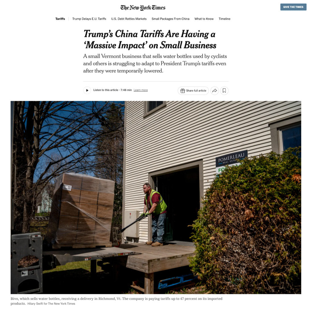 In a feature by Peter Eavis, The New York Times highlights the mounting challenges small businesses like Bivo face amid the escalating U.S.–China trade war. With 30%+ tariffs on certain Chinese goods, Bivo and other niche manufacturers are navigating steep cost increases and supply chain disruptions. The article captures how these changes are threatening innovation and stability for brands across the U.S.